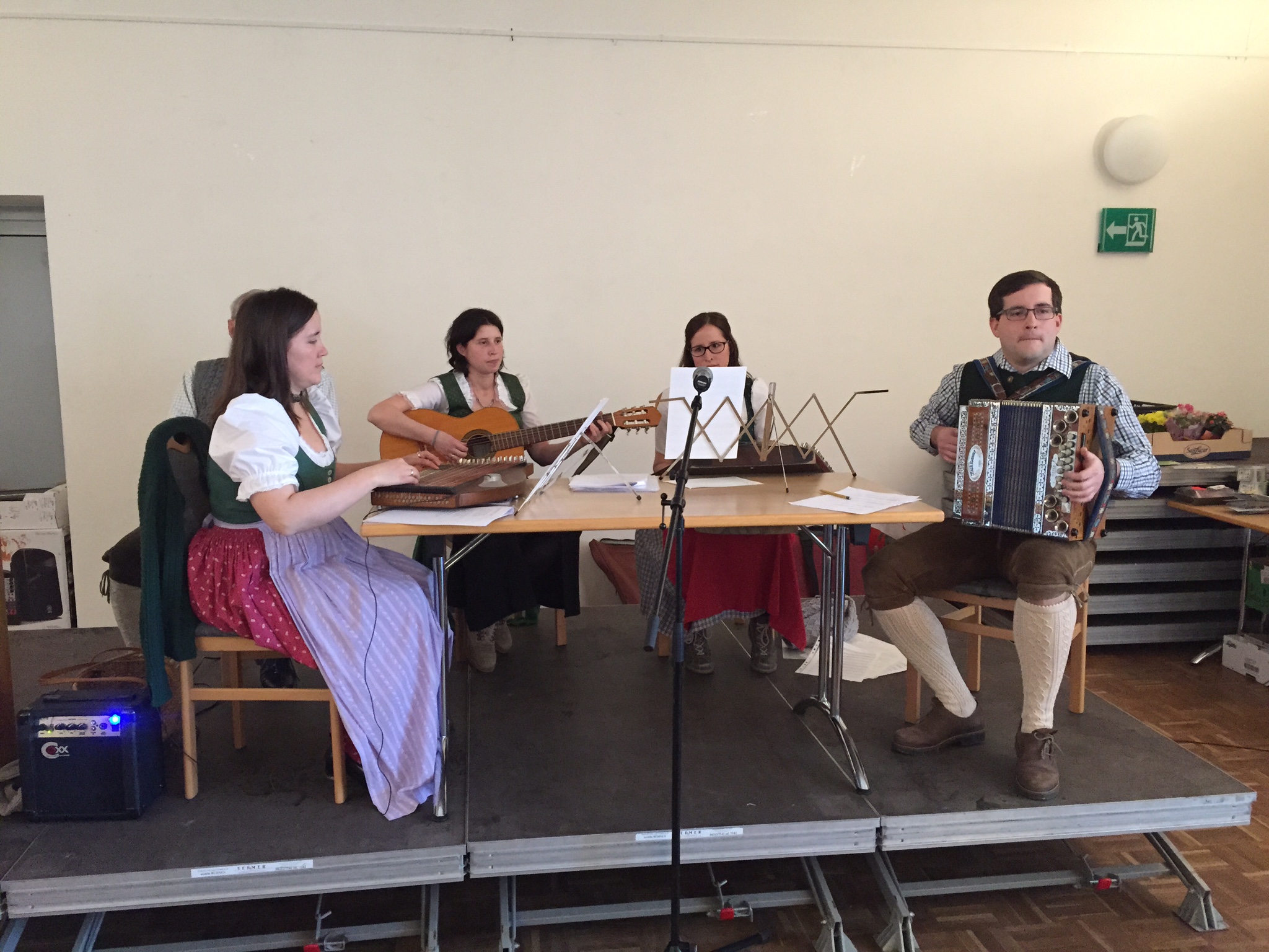 Ein Schmankerl der besonderen Art war dann das Nachmittagsprogramm mit der „Stubnmusi Leithenmair“ sowie mit Mundartdichter Adi Gasperlmair. Ein fein säuberlich, gut leserliches Liederheft mit allseits bekannten Volksliedern war vorbereitet worden und Sandra Forstinger, die Sprecherin der „Stubnmusi Leithenmair“ lud alsdann zum gemeinsamen Mitsingen herzlichst ein. Das ließen sich die anwesenden Gäste nicht zweimal sagen – bei „In die Berg bin i gern“, Wenn wir erklimmen“ oder das „Kufsteinlied“ sangen alle mit großer Begeisterung eifrig mit. Unterbrochen wurde die musikalische Darbietung von lustigen Mundartgedichten von Adi Gasperlmair, der mit amüsanten Anekdoten und Mundartgedichten die Lacher auf seiner Seite hatte.