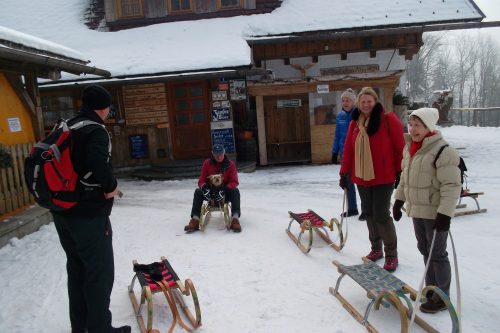 Mit den geliehenen Rodeln der Hochsteinalmhütte ging’s im Nu wieder zurück auf den Parkplatz und von dort wieder retour nach Wimsbach.