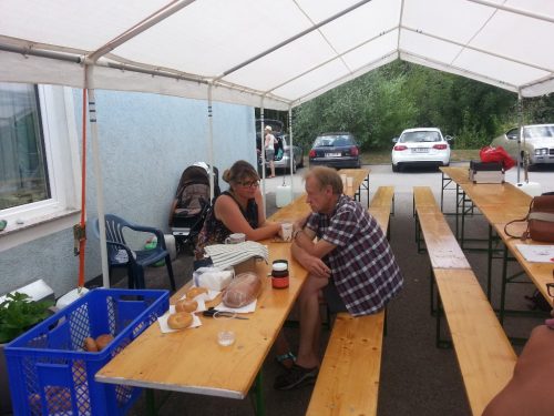 Dagmar und Reini beim Verschnaufkaffeetscherl nach der Raubtierfütterung
