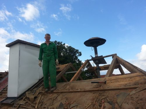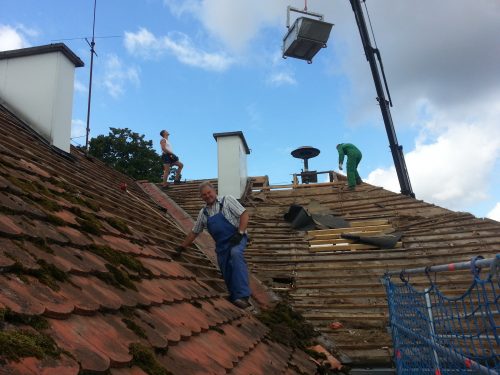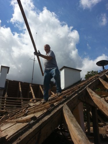 Rund 450 m² Dachstuhl wurden von den alten Dachziegeln und morschem Gebälk befreit, neu aufgebaut und dicht gemacht in nur 3 Tagen. Respekt vor dieser Leistung!