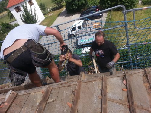Die Idee: 3 – 4 professionelle Zimmerer bekommen ein paar Hilfskräfte aus dem Gemeinderat zugeteilt, damit hier die Arbeit nach dem Motto “Viele Hände – schnelles Ende” flott und vor allem kostensparend von statten gehen sollte.