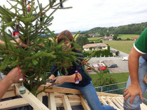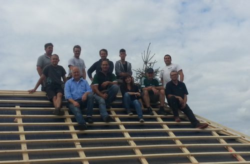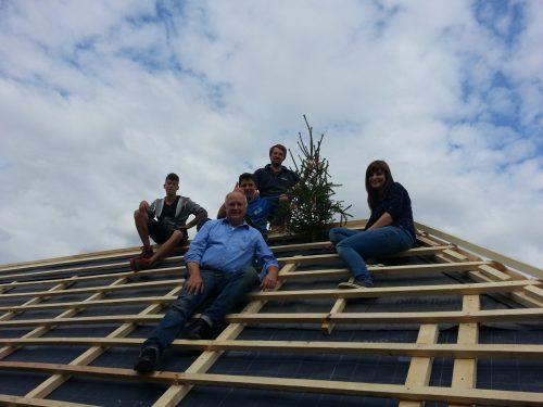 Neuer Vor-Ort Termin um 17 Uhr: Gruppenbild mit Dame, Dach fertig – Firstbaum schon vor Ort.