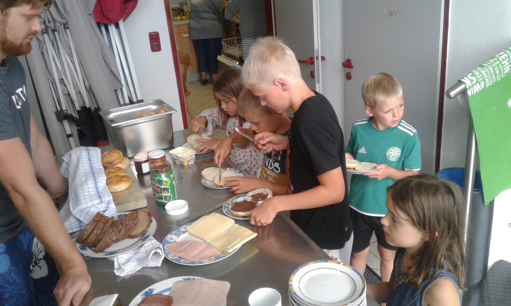 Am Sonntag war um 7 Uhr Tagwache und das Frühstück wurde vorbereitet. Kurz vor 8 Uhr kamen die ersten Kids und freuten sich auf das umfangreiche Frühstücksangebot: Nutella, Marmelade, Kakao, Schinken, Käse, Milch, Eier, Gemüse und Obst. Nach und nach war die volle Mannschaft versammelt.