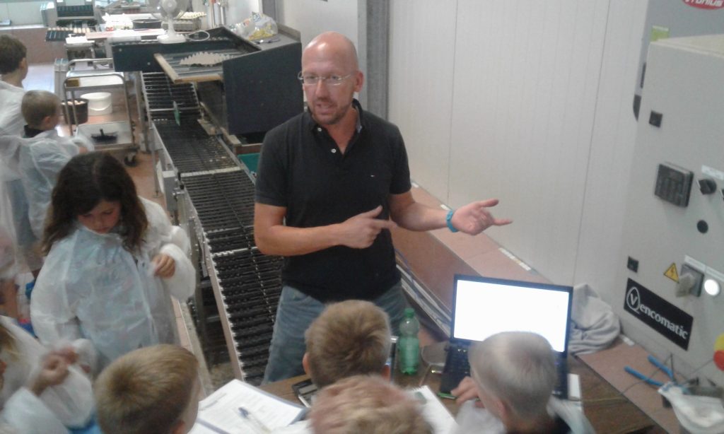 Bei der Besichtigung konnten sie auch die Beförderung der Eier auf Förderbändern miterleben. Die Kinder durften bei der Eierkontrolle mithelfen, bei der kaputte oder beschmutzte, zu kleine oder zu große Eier aussortiert wurden. Eier müssen mindestens 48 g haben, damit sie für die Kükenproduktion verwendet werden können. In einem weiteren Schritt wurden die Eier mittels Saugnäpfen auf große Paletten gelegt und anschließend in große Transportwagen hineingeschlichtet. Die gesamte Produktion ist vollständig computerunterstützt.