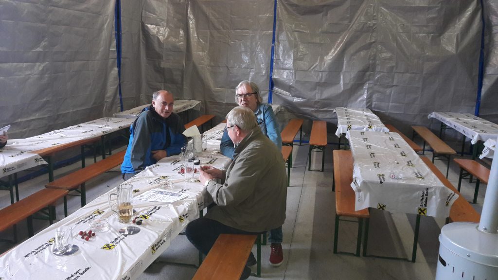 Am nächsten Tag war es dann soweit. Reini Hager kochte ein hervorragend zubereitetes Kesselgulasch und wurde dabei von vielen Frauen unterstützt, die die Veranstaltung mit vielen köstlichen Kuchen und Torten unterstützten. Die Männer machten in der Zwischenzeit das Siedlerheim für die Gulaschparty bereit – die Tische wurden gedeckt und Getränke bereitgestellt.