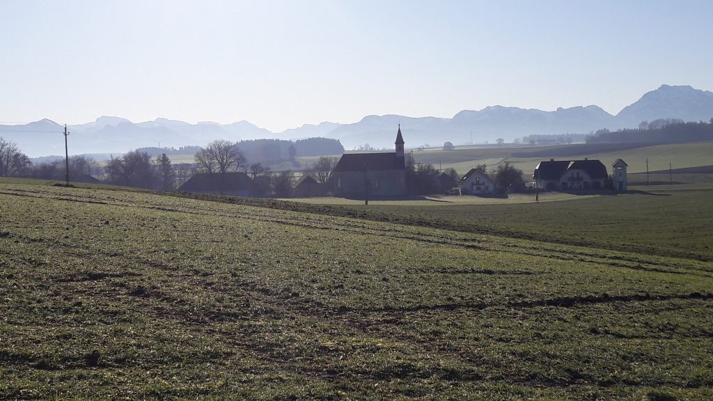 Im Vordergrund war bereits das nächstes Ziel, die Wimkirche, zu sehen und über Dorfham spazierte die Wandergruppe den alten Schul- und Kirchenweg entlang Richtung Wim.